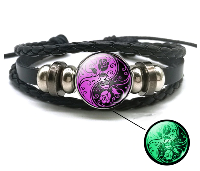 Náramek ve tvaru Yin Yang. Symbol Jin a jang má původ v čínské filozofii a značí dvě opačné doplňující se síly. Obrázek na náramku po nasvícení svítí ve tmě.