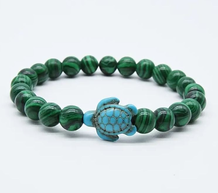 Náramek s tyrkysovou želvičkou. Náramek želva je skvělý doplněk na ruku pro člověka, co miluje želvičky. Náramek má nejmenší průměr 6 cm, ale je na gumičce a lze trošku roztáhnout.