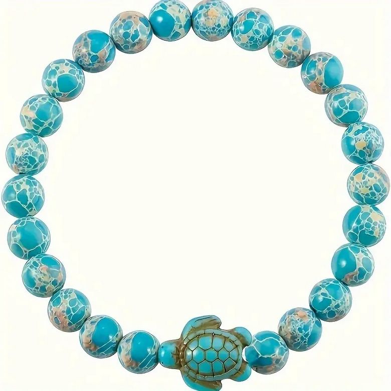 Náramek s tyrkysovou želvičkou. Náramek želva je skvělý doplněk na ruku pro člověka, co miluje želvičky. Náramek má nejmenší průměr 6 cm, ale je na gumičce a lze trošku roztáhnout.