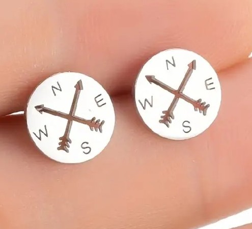 Ocelové náušnice s kompasem, kde jsou čtyři světové strany - sever, jih, východ a západ.