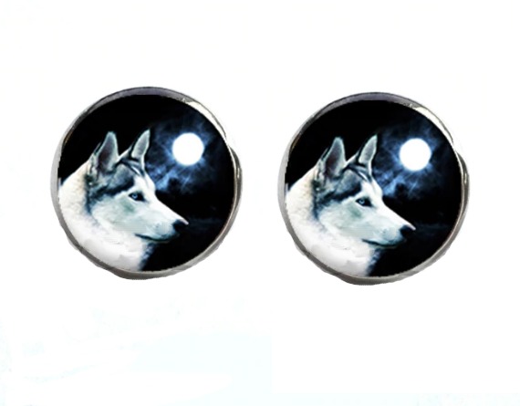Bižuterní náušnice s vlkem. Na obrázku vidíme bílého vlka a za ním obrovský měsíc.