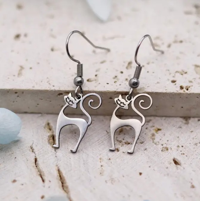 Ocelové náušnice ve tvaru roztomilé kočky se zdviženým ocasem. Náušnice kočka jsou vhodné pro všechny milovníky koček.