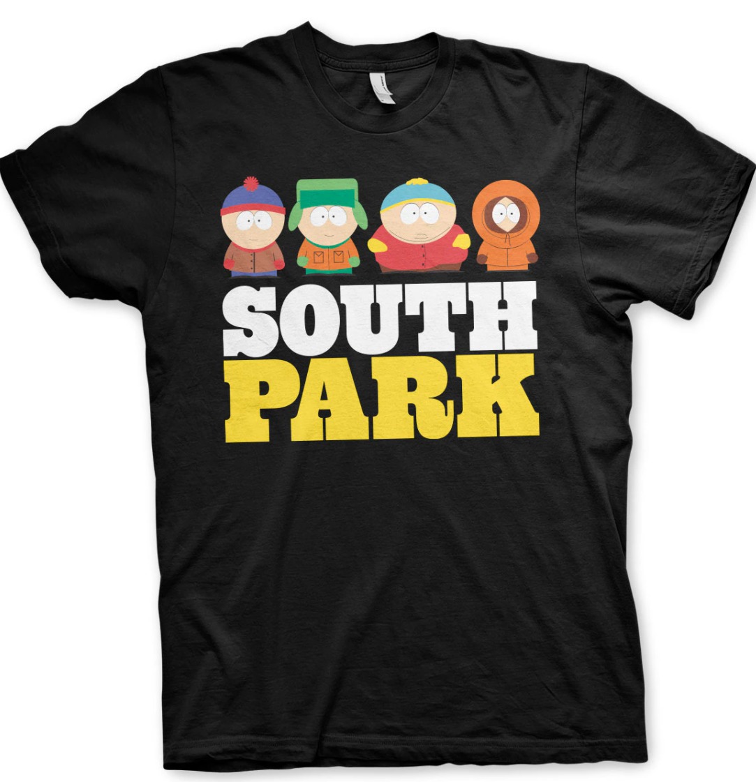 Licencované černé pánské tričko z komediálního seriálu Městečko South Park. Na tričku jsou čtyři hlavní postavy - Kenny, Kyle, Cartman a Stan. Pod nimi je nápis South Park.