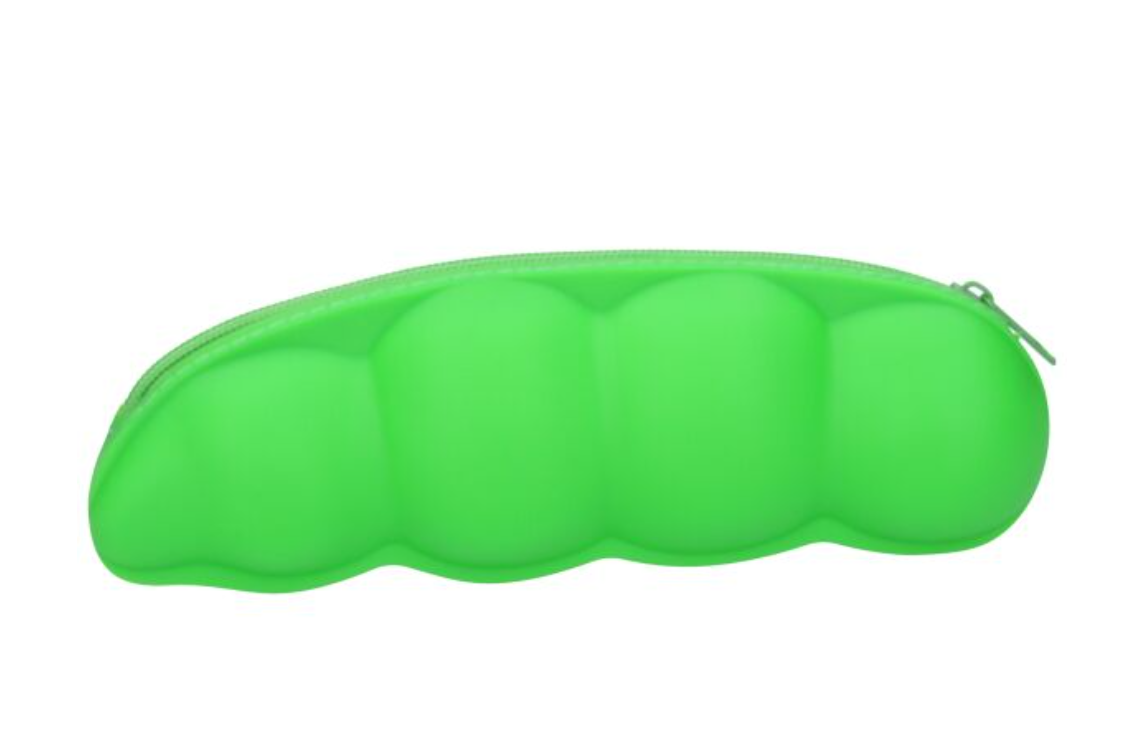 Zelený silikonový penál na psací potřeby ve tvaru lusku hrášku. Pouzdro hrášek sice vypadá chutně, ale není k jídlu. Radši si do pouzdra vlož tužky, propisky, gumy a jiné psací potřeby.