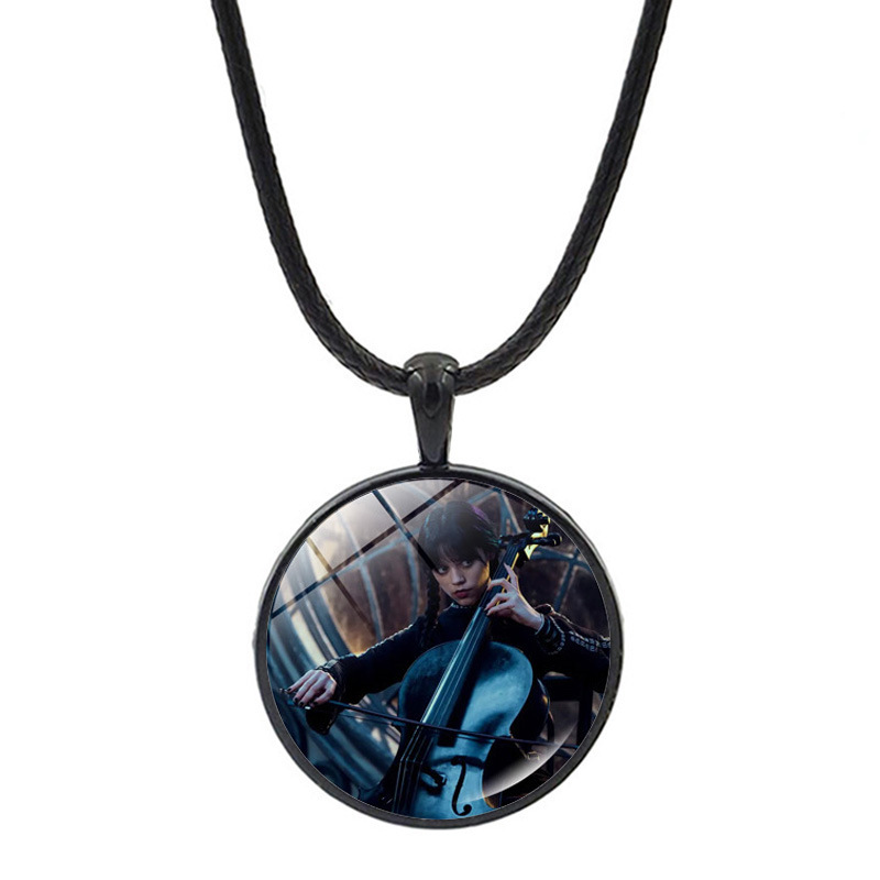 Náhrdelník a přívěsek s motivem úspěšného seriálu Wednesday. Na obrázku přívěsku vidíme hlavní postavu Wednesday Adamsovou (herečka Jenna Ortega), která hraje na hudební nástroj violoncello.