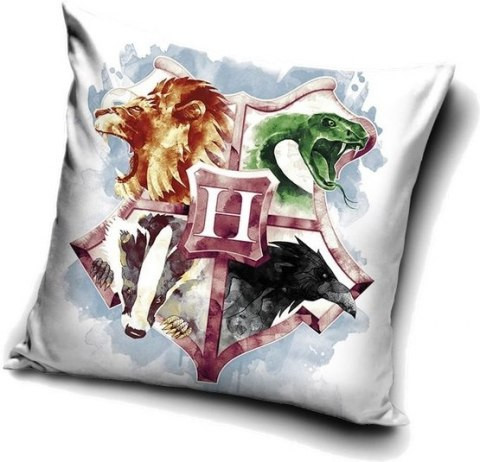 Povlak na polštář s motivem knih a filmů Harry Potter - Bradavice (Hogwarts). Polštář je bílé barvy a jsou na něm vyobrazeny jednotlivé bradavické koleje a k nim patřící zvířata - Nebelvír, Zmijozel, Havraspár a Mrzimor.