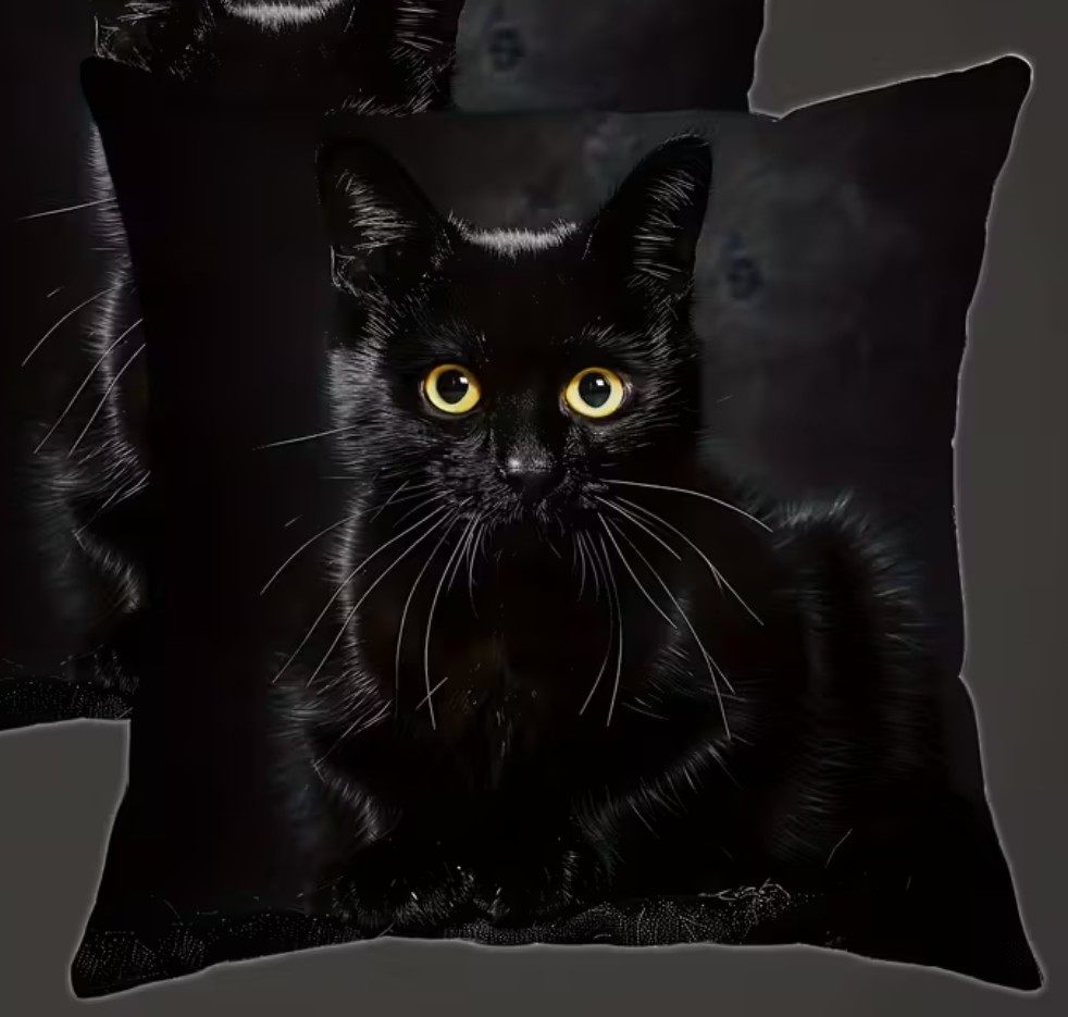 Povlak na polštář s černou kočkou se žlutýma očima. Povlak ocení každý milovník kočiček!