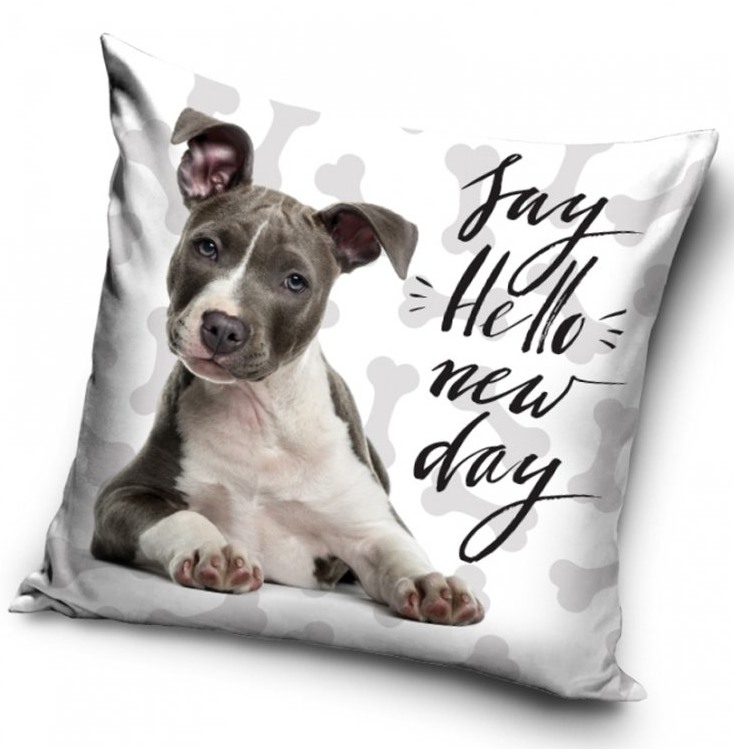 Povlak na polštář s pejskem - roztomilým štěňátkem stafordíkem. Na povláčku je nádherné ležící šedobílé štěňátko stafordširského bulteriéra. Vedle pejska je anglický nápis Say Hello New Day. Povlak je bílé barvy a v pozadí jsou šedé kostičky.