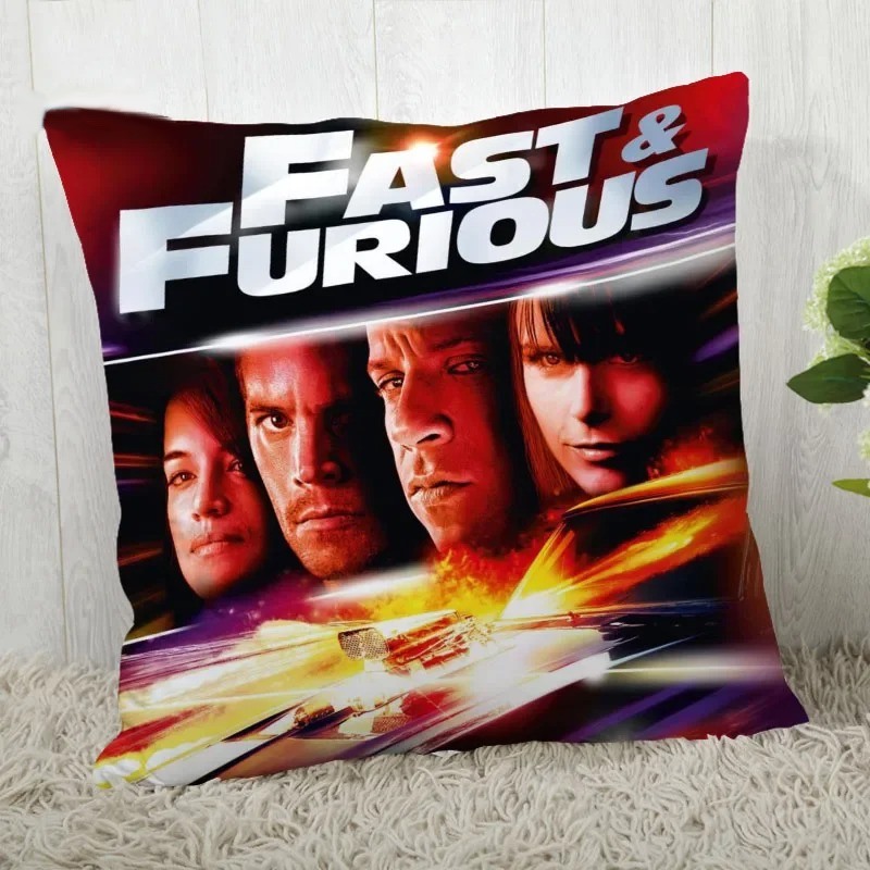 Povlak na polštář s motivem akčního filmu Rychle a zběsile. Na povlaku jsou hlavní postavy a nápis Fast & Furious. V dolní části povlaku je auto.