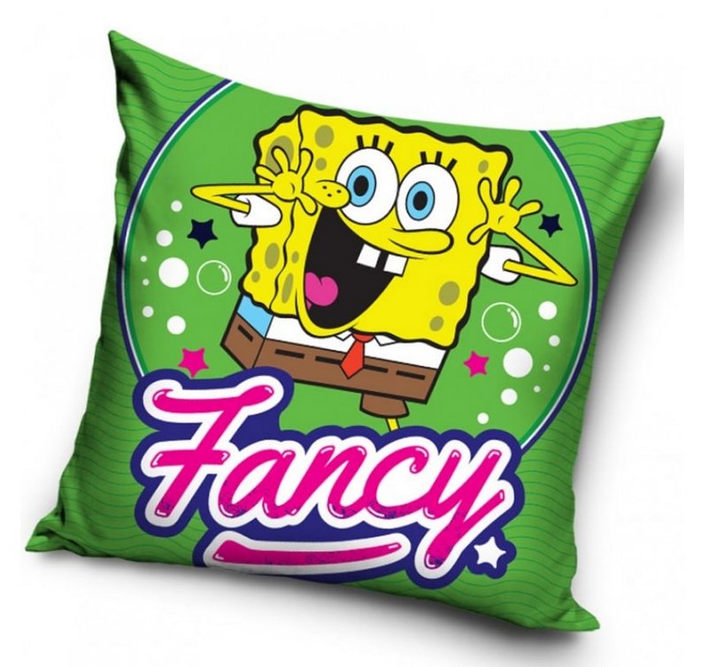 Zelený povlak na polštář s mořskou houbou SpongeBobem. Spongebob má radost, za ním jsou bublinky a před ním nápis Fancy, na sobě má jako obvykle hnědé kalhoty.