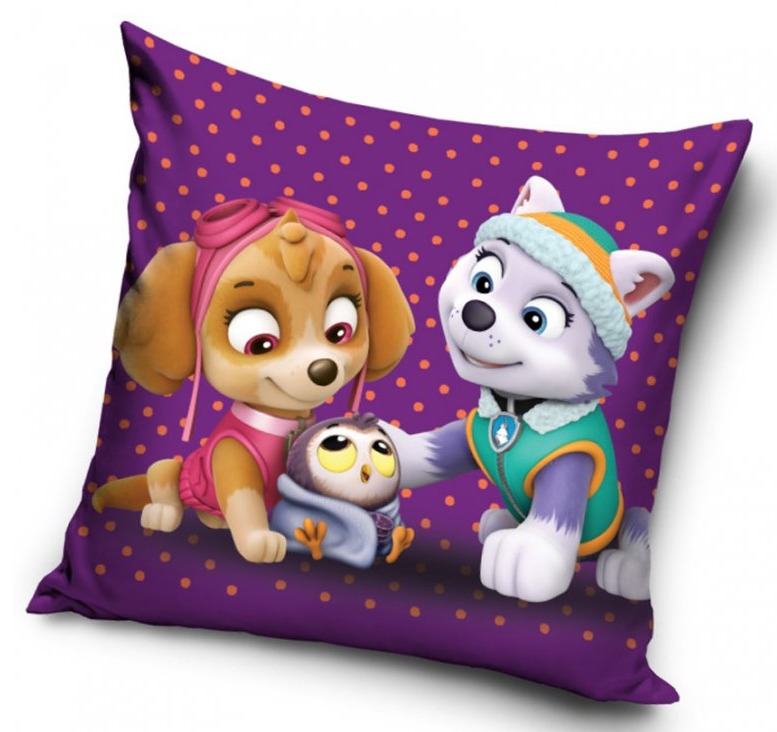 Povlak na polštář Tlapková patrola. Na povláčku jsou dva roztomilí pejsci a sovička v dečce. Dvě psí fenečky (Skye a Everest) se něžně o sovičku Huhu starají. Oficiální licence.
