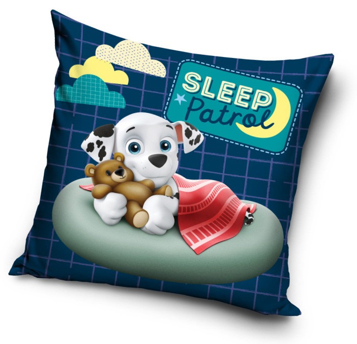 Povlak na polštář Tlapková patrola. Na povláčku je ospalý dalmatinek, který svírá v tlapkách medvídka. Sám je zakrytý červenou přikrývkou. Nad ním můžeme vidět nápis Sleep Patro - Spací patrola.