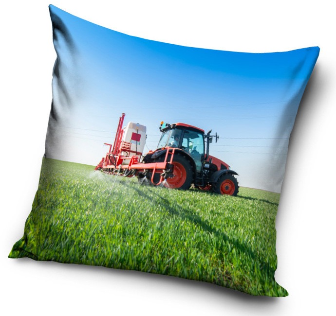 Povlak na polštář traktor na poli. Na povlaku je obrovský červený traktor s vlečkou a velkými černými koly. Skvělý dárek pro všechny traktoristy a milovníky traktorů.