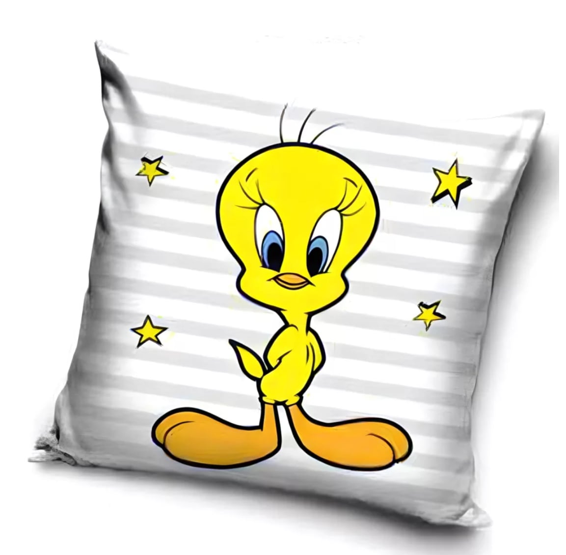 Povlak na polštář Looney Tunes - Tweety. Na povláčku je stojící žlutý ptáček Tweety, který na svět kouká průzračnýma modrýma očima, kolem něj jsou žluté hvězdičky.