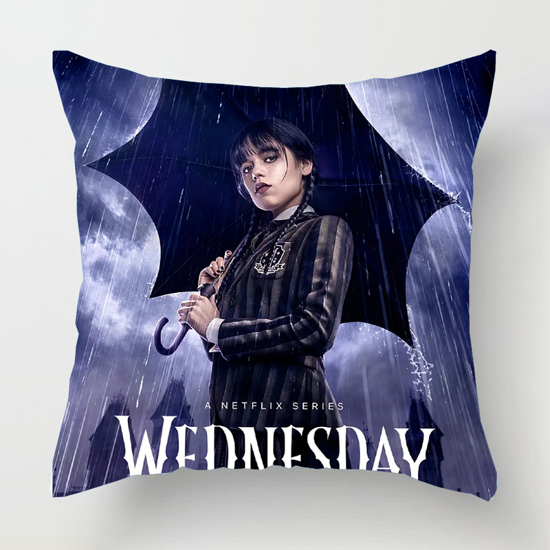 Povlak na polštář ze seriálu Wednesday. Na povlaku je hlavní postava Wednesday Adamsová s černým deštníkem a v tmavých šatech. Pro Wednesday jsou temné barvy součástí její osobnosti.