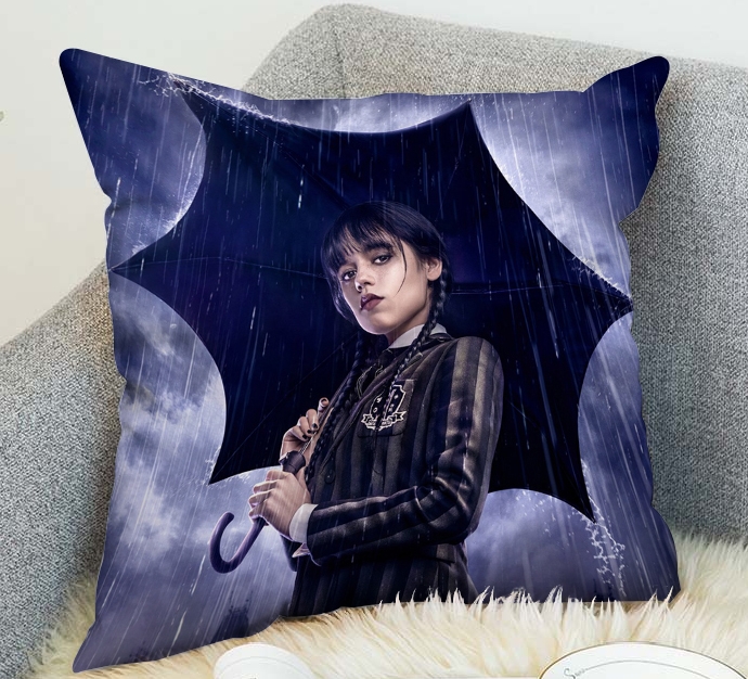 Povlak na polštář ze seriálu Wednesday. Na povlaku je hlavní postava Wednesday Adamsová s černým deštníkem a v tmavých šatech. Pro Wednesday jsou temné barvy součástí její osobnosti.