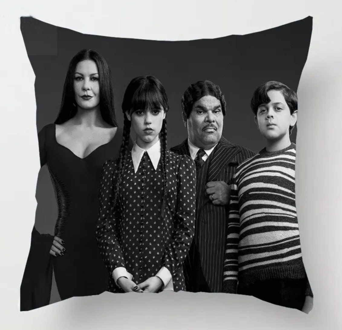 Povlak na polštář ze seriálu Wednesday. Na povlaku je hlavní postava Wednesday Addamsová (Jenna Ortega) s rodinou - mámou, tátou, bratrem...