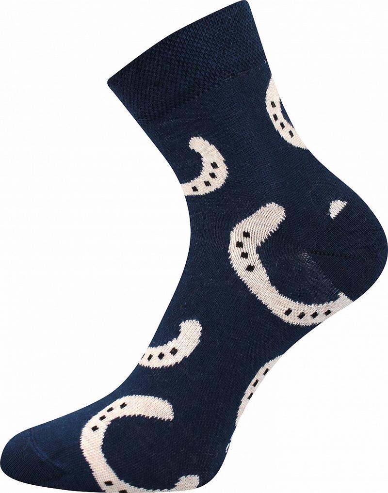 Roztomilé tmavě modré bavlněné dámské ponožky s podkovami. Ponožky podkova jsou vhodné pro člověka, co v životě potřebuje kapku štěstí. Ponožky jsou vhodné na celodenní nošení, mají volný lem, který nestahuje nohy a neškrtí. Ponožky se budou suprově nosit třeba na jaře či v létě.