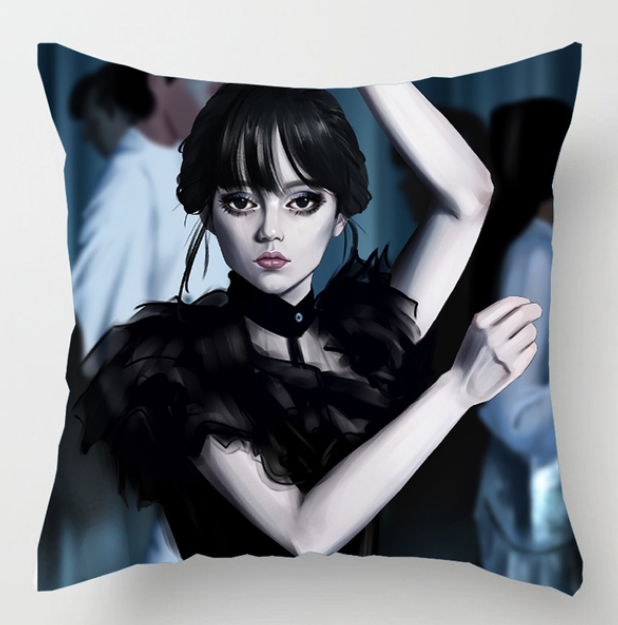 Povlak na polštář ze seriálu Wednesday. Na povlaku je hlavní postava Wednesday Adamsová, kterou ztvárnila herečka Jenna Ortega. Wednesday je oděna v černých večerních šatech a právě tancuje.