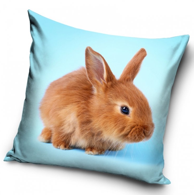 Povlak na polštář rezavý králíček. Na povláčku je huňatý a malinkatý rezavý králíček se vztyčenými oušky. Povlak je laděn do modré barvy.