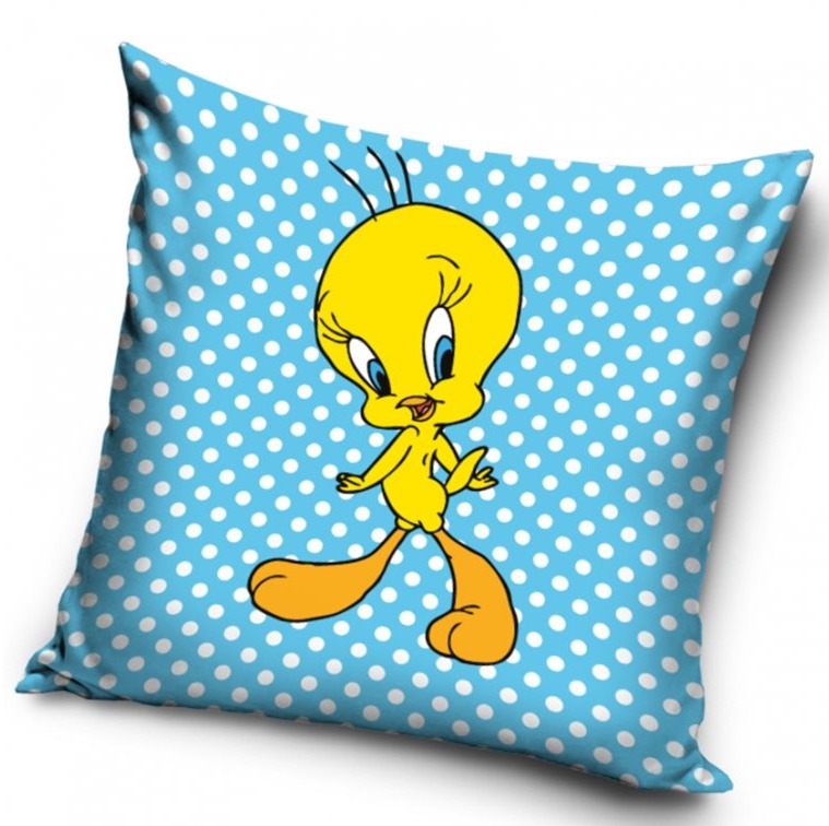 Povlak na polštář Looney Tunes - Tweety. Na povláčku je stojící žlutý ptáček Tweety, který na svět kouká průzračnýma modrýma očima, kolem něj jsou bílé puntíky, pozadí je modré barvy.