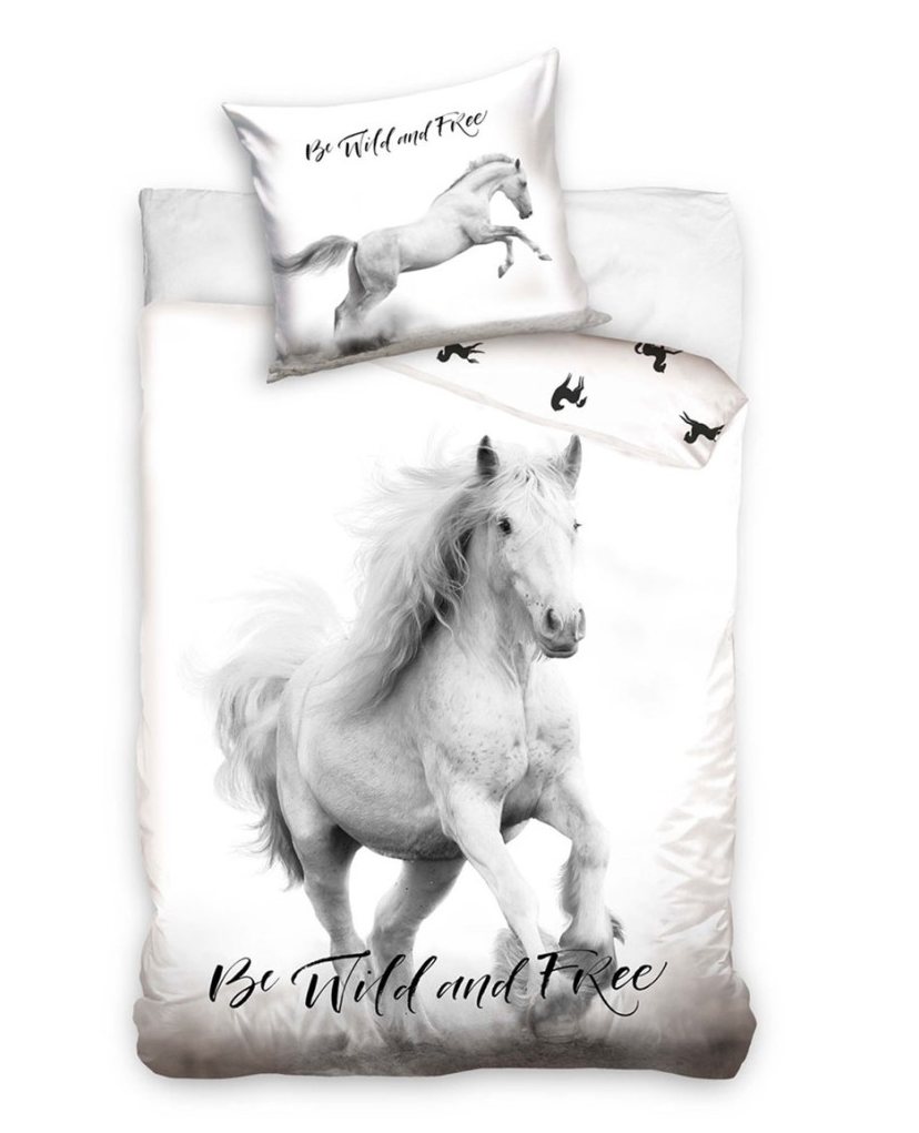 Kvalitní bavlněné povlečení na polštář a peřinu s bílým běžícím koněm. Povlečení kůň je skvělý dárek pro každou holčičku i chlapečka, co miluje koně. Je vhodné pro děti i dospělé. Na obrázku na povlaku na polštář je bílý skákající kůň a nápis Be wild and free. Povlečení je oboustranné, kdy z druhé strany je bílé barvy s černými koňmi.