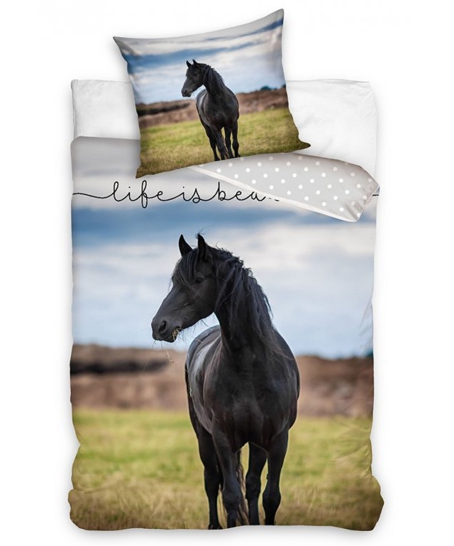 Kvalitní bavlněné povlečení na polštář a peřinu s koněm, kde na obrázku na jedné straně jenádherný černý kůň, pod ním vidíme trávu a nad ním modrou oblohu. Z druhé strany je povlečení se vzorem bílých puntíků. Na povlaku na polštář je taktéž černý stojící mustang.