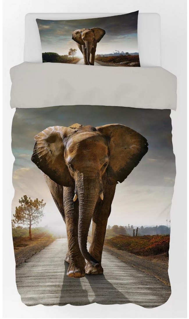 Bavlněné ložní povlečení se slonem. Na přední straně povlečení je slon, co kráčí po cestě, okolo něj je krajina. Na povlaku na polštář je stejný obrázek jak na povlaku na peřinu. Rozměry jsou peřina 140x200 cm a polštář 70x90 cm. Vhodné pro holky i kluky.