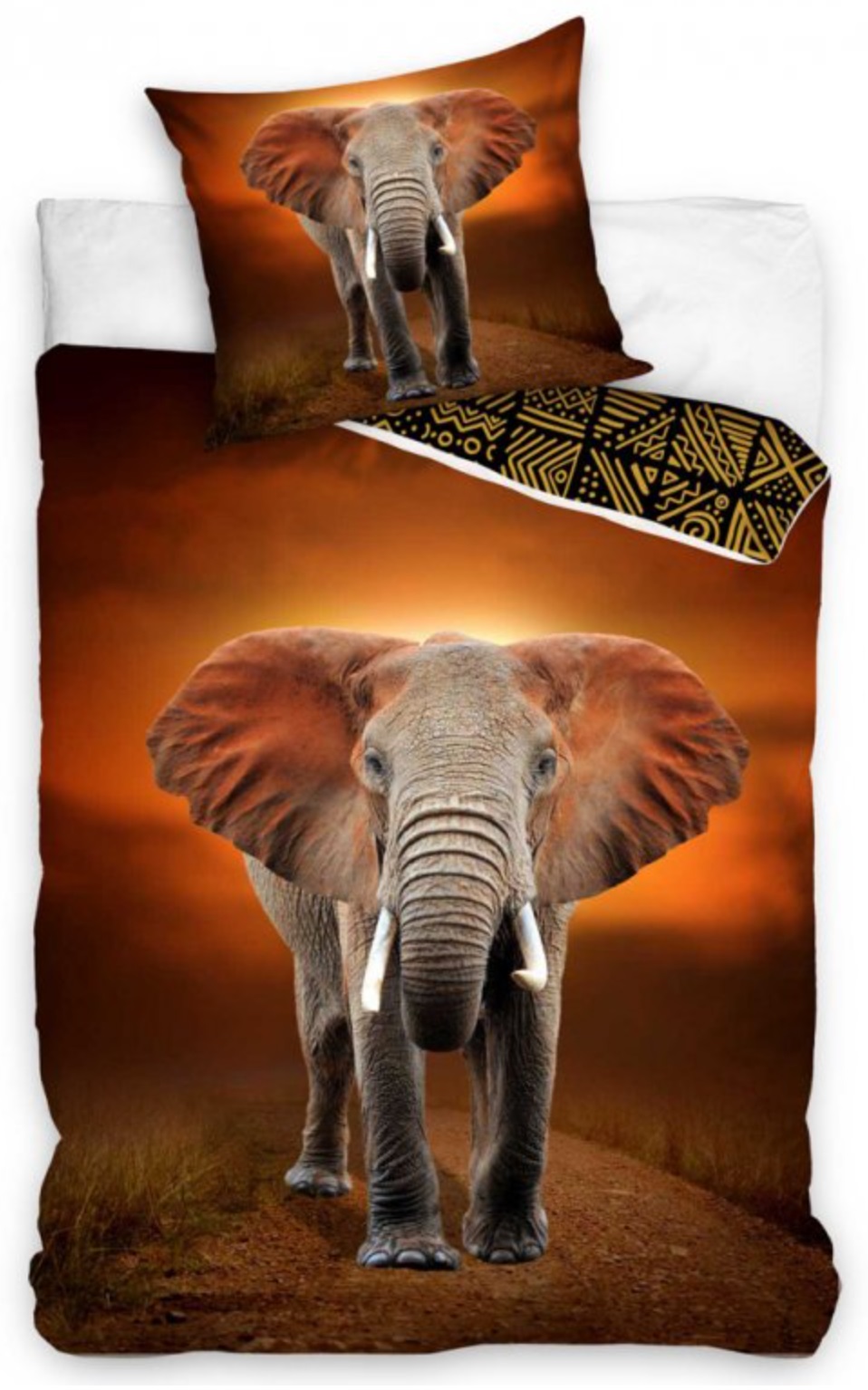 Bavlněné ložní povlečení se slonem. Na přední straně povlečení je slon při zapadajícím slunku a z druhé strany je povlečení se vzorem etno. Povlečení je laděno do příjemných teplých barev, aby nám zlepšilo náladu a uklidnilo nás. Na povlaku na polštář je stejný obrázek jak na povlaku na peřinu. Rozměry jsou peřina 140x200 cm a polštář 70x90 cm. Vhodné pro holky i kluky.