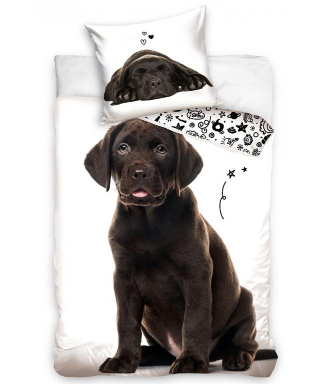 Bavlněné ložní povlečení na polštář a peřinu s roztomilým sedícím štěňátkem - hnědým labradorem. Na přední straně je hnědé štěňátko s růžovým jazykem. Z druhé strany jsou různé černé obrázky. Na povlaku na polštář vidíme spící štěňátko.