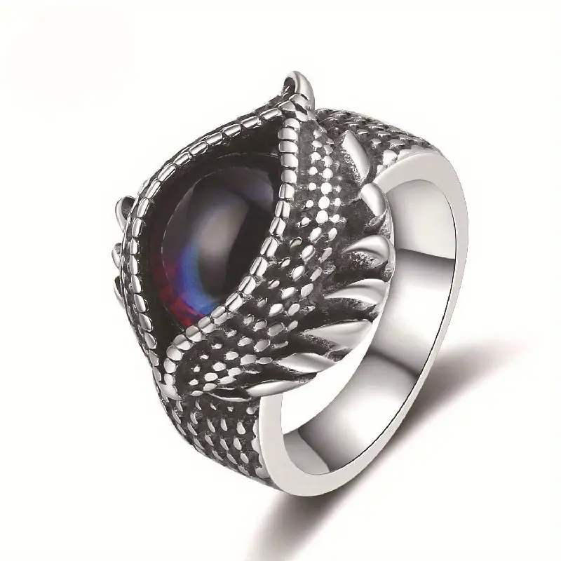 Ocelový prstýnek ve tvaru drsného dračího oka - dračí oko je fialovočerné barvy. Díky kvalitnímu materiálu se nemusíte bát, že změní barvu a můžete ho tak nosit i do sprchy.