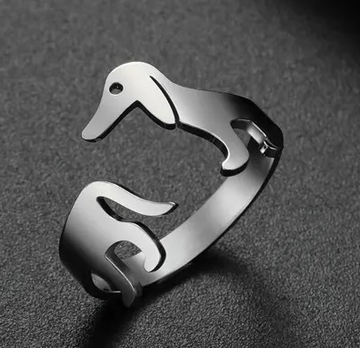 Nerez ocelový prstýnek stříbrné barvy ve tvaru pejska jezevčíka. Prsten jezevčík je vytvořen tak, že hlava jezevčíka na jedné straně začíná, poté se obtočí kolem prstu tak, že vytvoří prstýnek, a na druhé straně z toho vyjdou jezevčíkovy nohy a ocásek. Průměr je trošku nastavitelný - před úpravou má 1,8 cm