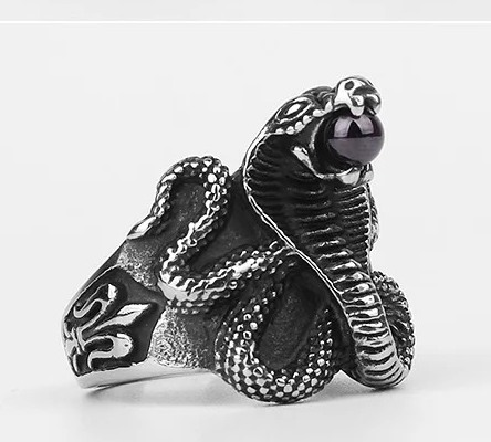 Ocelový prsten s hrozivě vypadajícím hadem - kobrou. Prstýnek kobra, co má v puse černou kuličku, je vhodný pro muže i ženy. Skvěle se bude vyjímat na prstu člověka, co má pro strach uděláno, nebo jen jednoduše miluje hady.