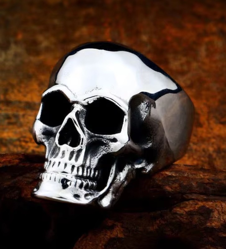 Nerez ocelový prsten s drsně vypadají lebkou. Prstýnek lebka a kosti je vhodný pro motorkáře, rockery, metalisty a jiné drsňáky. Mohou ho nosit muži i ženy.