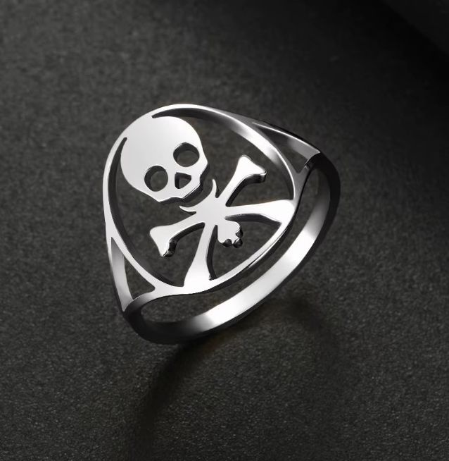 Nerez ocelový prsten s drsně vypadají lebkou. Prstýnek lebka a kosti je vhodný pro motorkáře, rockery, metalisty a jiné drsňáky. Mohou ho nosit muži i ženy.