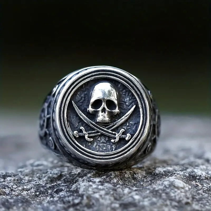 Nerez ocelový prsten s drsně vypadají pirátskou lebkou a překříženými meči / šavlemi. Prstýnek lebka je vhodný pro motorkáře, rockery, metalisty a jiné drsňáky. Mohou ho nosit muži i ženy.
