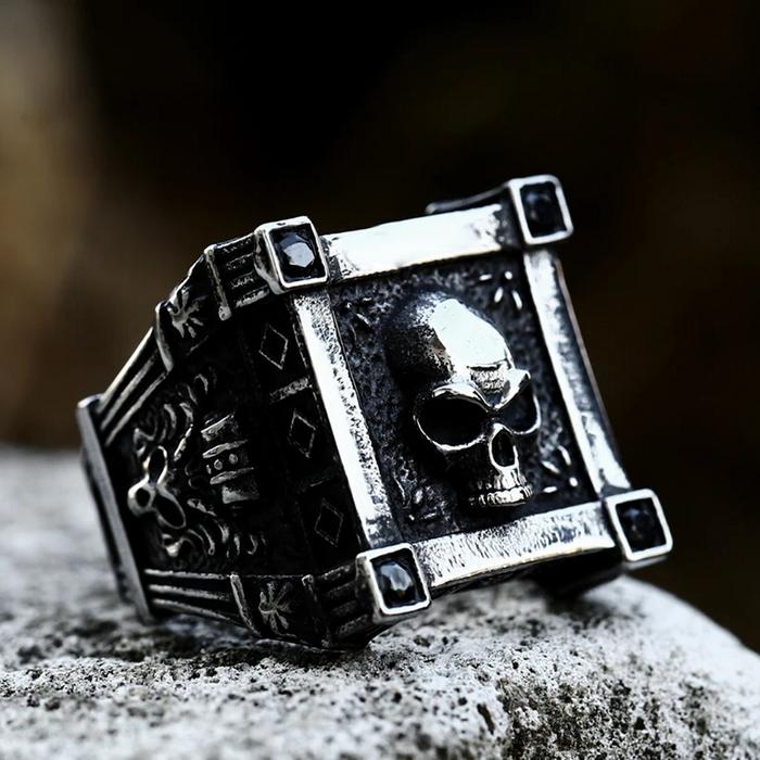 Nerez ocelový prsten s drsně vypadají lebkou a černými kamínky. Prstýnek lebka je vhodný pro motorkáře, rockery, metalisty a jiné drsňáky. Mohou ho nosit muži i ženy.  Díky kvalitnímu materiálu ho můžete nosit i do vody.  Varování: Nevhodné pro děti mladší 36 měsíců, obsahuje malé části, které by... celý popis