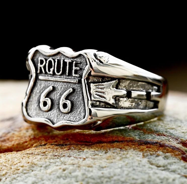 Nerez ocelový prsten Route 66 je super doplněk na ruku pro každého správného motorkáře. Prstýnek je stříbrné barvy.