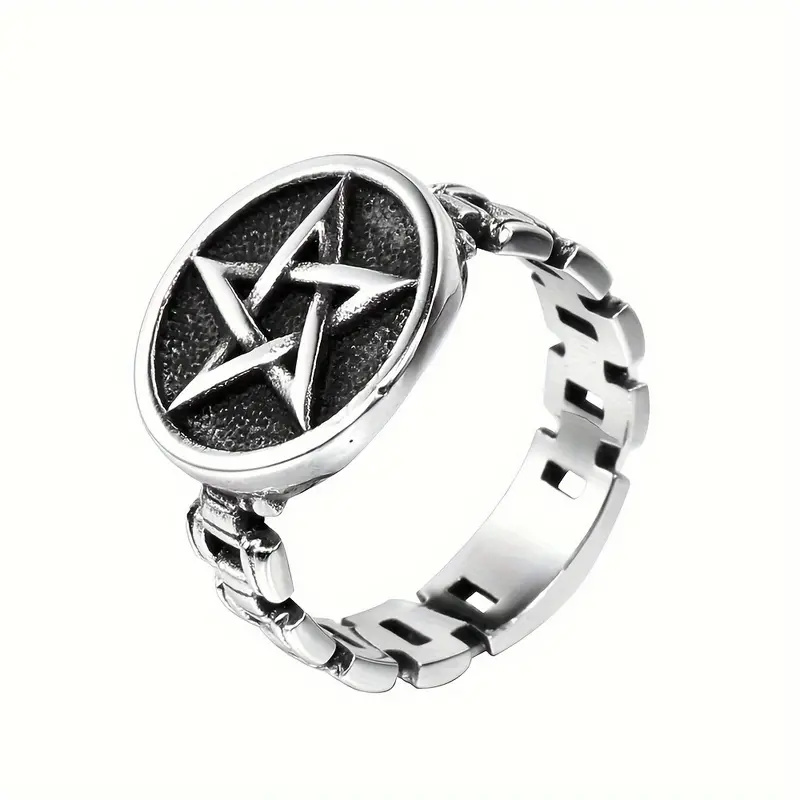 Nerez ocelový prsten s pentagramem. Prstýnek pentagram je vhodný pro všechny, kteří mají nějaký vztah k tomuto symbolu. Pentagram je prastarý symbol pěticípé hvězdy, kterému se přisuzuje ochranná magická funkce.
