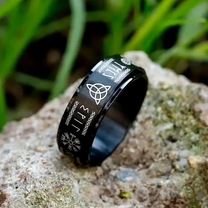 Ocelový prsten vikingské runy. Prstýnek viking - runy - vegvisir, triskelion a jiné je černé barvy. Je vyroben z nerez oceli, takže si ho můžete vzít i do sprchy nebo do vany :) Tento vikingský prsten je vhodný pro muže i ženy.