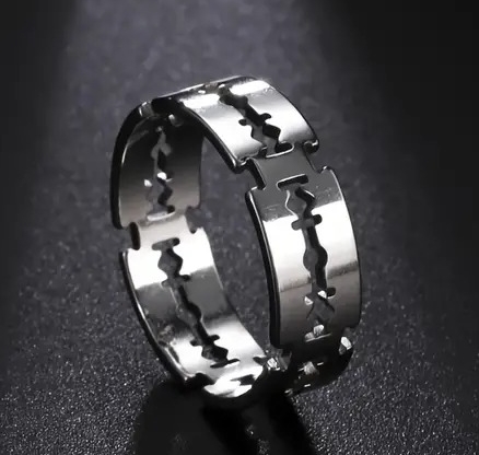 Ocelový prsten se žiletkami. Prstýnek žiletka je stříbrné barvy a je to originální šperk na ruku muže i ženy.