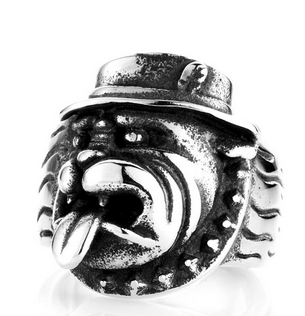 Ocelový prsten se psem - bulldog s vyplazeným jazykem a kloboukem. Stylový prstýnek s pejskem je vhodný pro muže i ženy. Díky kvalitní oceli ho můžete nosit do vody.
