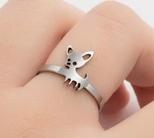 Ocelový prsten s roztomilým pejskem čivavou. Prstýnek čivava je stříbrné barvy a je to skvělý dárek pro všechny milovníky tohoto psího plemene.