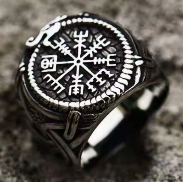 Nerez ocelový severský vikingský prsten - vikingské runy. Prstýnek vegvisir je vyroben z kvalitní oceli, takže si ho můžete vzít i do sprchy nebo do vany :) Tento vikingský prsten s kompasem je vhodný pro muže i ženy.