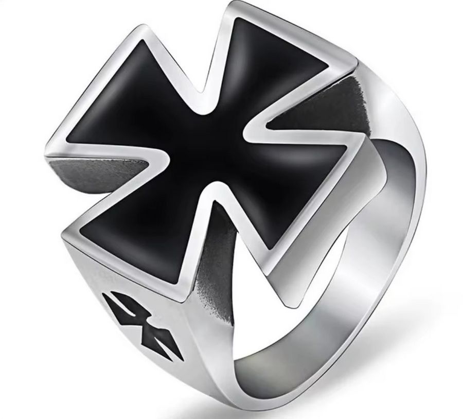Nerez ocelový prsten s černým křížem. Prsten kříž je stříbrné barvy.