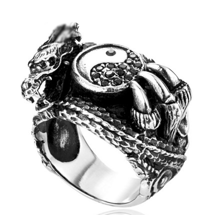 Nerez ocelový prsten znázorňující odvrácené strany temnoty a světla Yin a Yang (jin a jang) a drápy. Prsten můžou nosit muži i ženy.