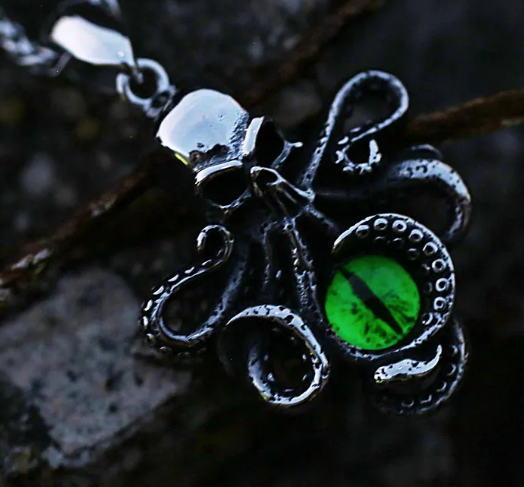 Ocelový náhrdelník a přívěšek se zlověstnou chobotnicí a zeleným okem. Řetízek chobotnice je skvělý doplněk pro všechny drsňáky!