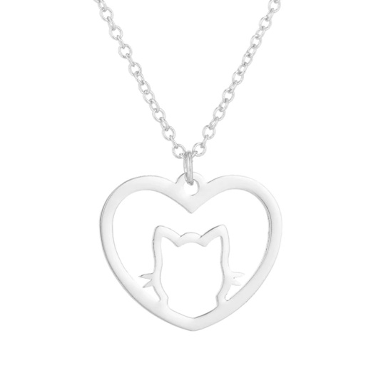 Ocelový romantický náhrdelník a přívěsek kočka se stříbrnou hlavou kočky v srdíčku. Kočičí řetízek a přívěsek je vhodný šperk pro všechny milovníky koček.