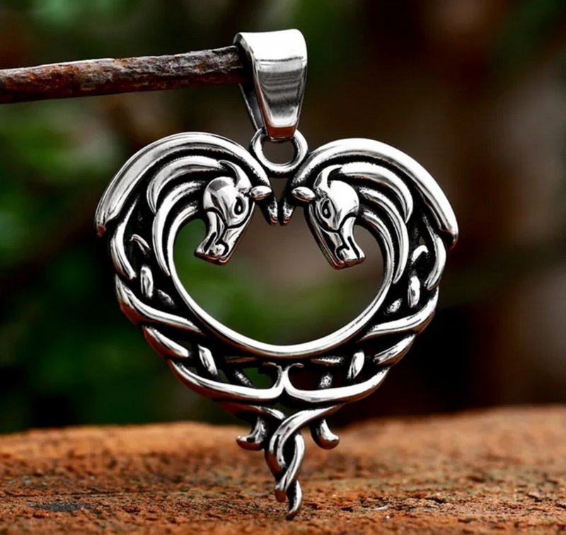 Ocelový koňský náhrdelník. Řetízek se 2 koni pro všechny milovníky těchto mohutných zvířat. Přívěsek kůň působí romanticky, protože koňské hlavy jsou ve tvaru srdíček, přičemž jejichž hlavy se dotýkají.