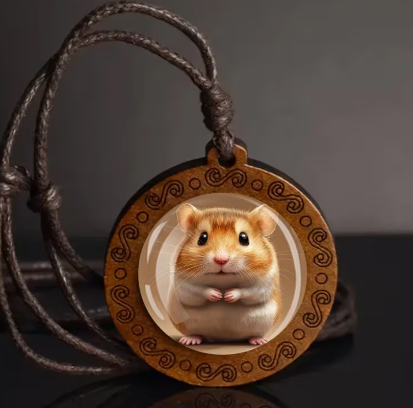 Bižuterní náhrdelník a přívěsek se buclatým křečkem. Na obrázku vidíme křečka.